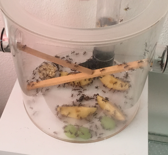 Die Nahrung in der Ameisenhaltung besteht oft aus Proteinen, z. B. Fruchtfliegen, Mehlwürmer oder spezielles Protein-Gel. Zuckerwasser oder Honigwasser als Energiequelle. Früchte z. B. Apfelstücke, Banane oder Trauben.