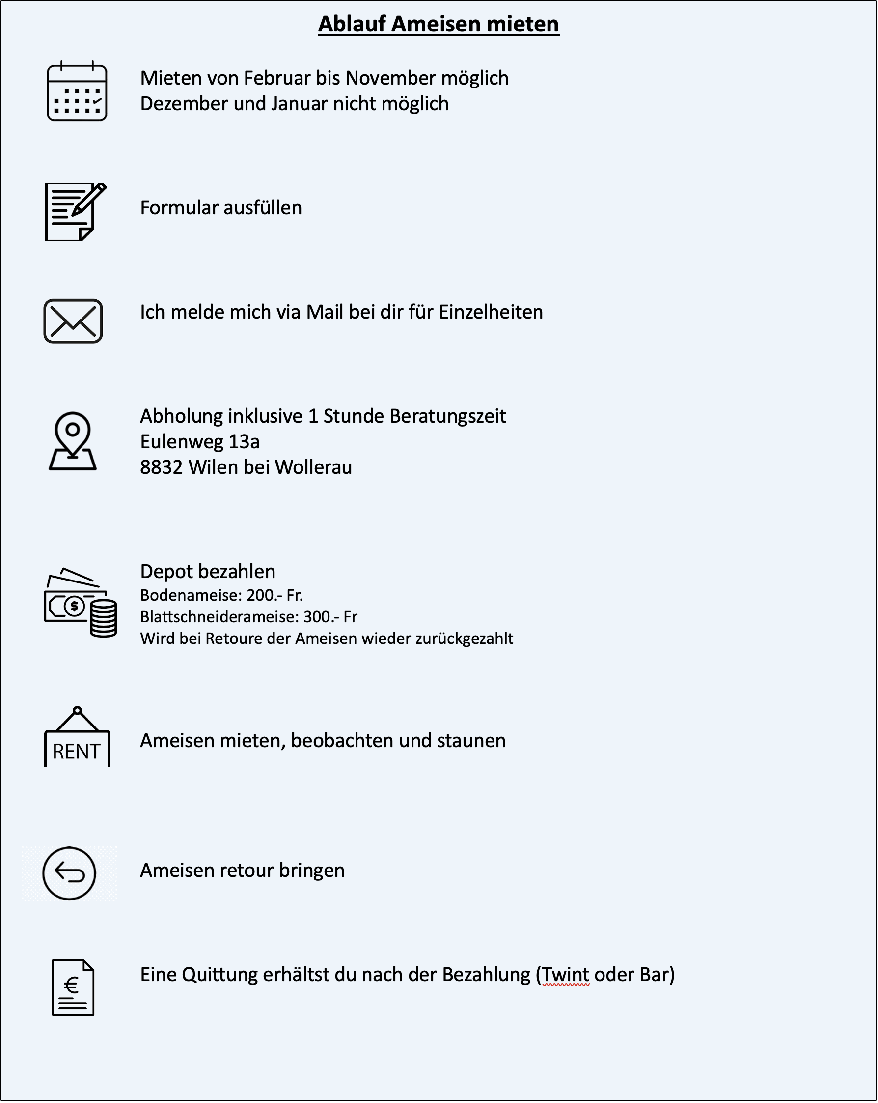 Ein Depot-Pfandgeld ist bei Mietbeginn für die ausgeliehene Ameisenkolonie vor Ort zu begleichen. Die mietbaren Ameisenkolonien – Ameisenvölker haben bei mir in der Schweiz unter meiner Aufsicht und Pflege gegründet. Die Kolonien werden erst ab einer bestimmten Koloniegrösse und Stabilität freigegeben und vermietet.
